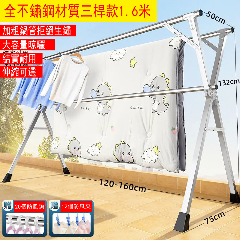 7分鐘前【下單即送20個防風掛鉤】不鏽鋼免安裝折疊家用伸縮式晾衣架 - 2025升級鞋架款1.6米 【可伸縮-送20個防風鉤+12個防風夾】NT$1890