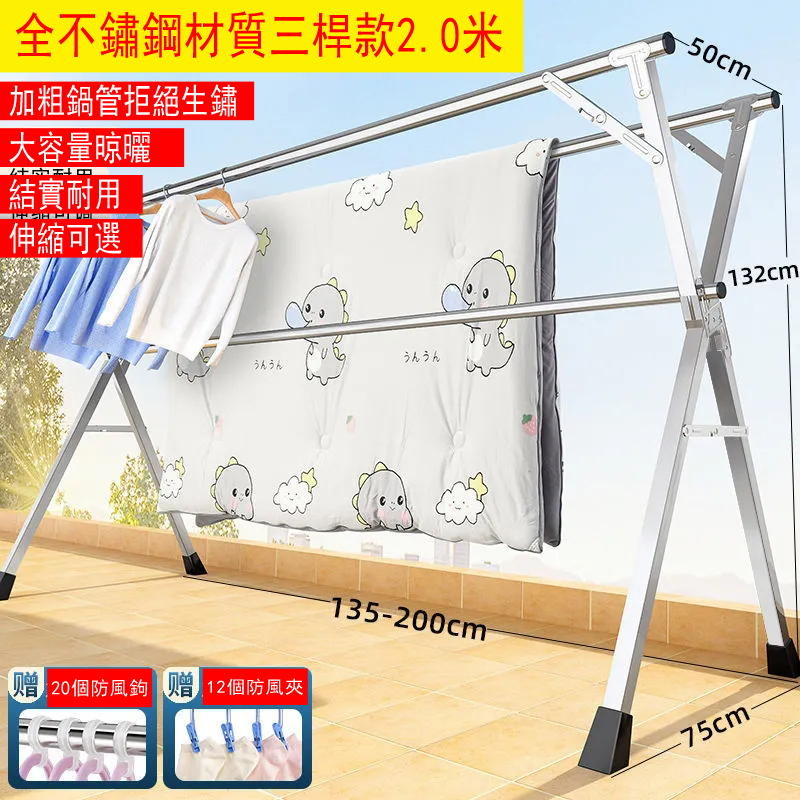 11分鐘前【下單即送20個防風掛鉤】不鏽鋼免安裝折疊家用伸縮式晾衣架 - 2025升級鞋架款2.0米 【可伸縮-送20個防風鉤+12個防風夾】NT$1990