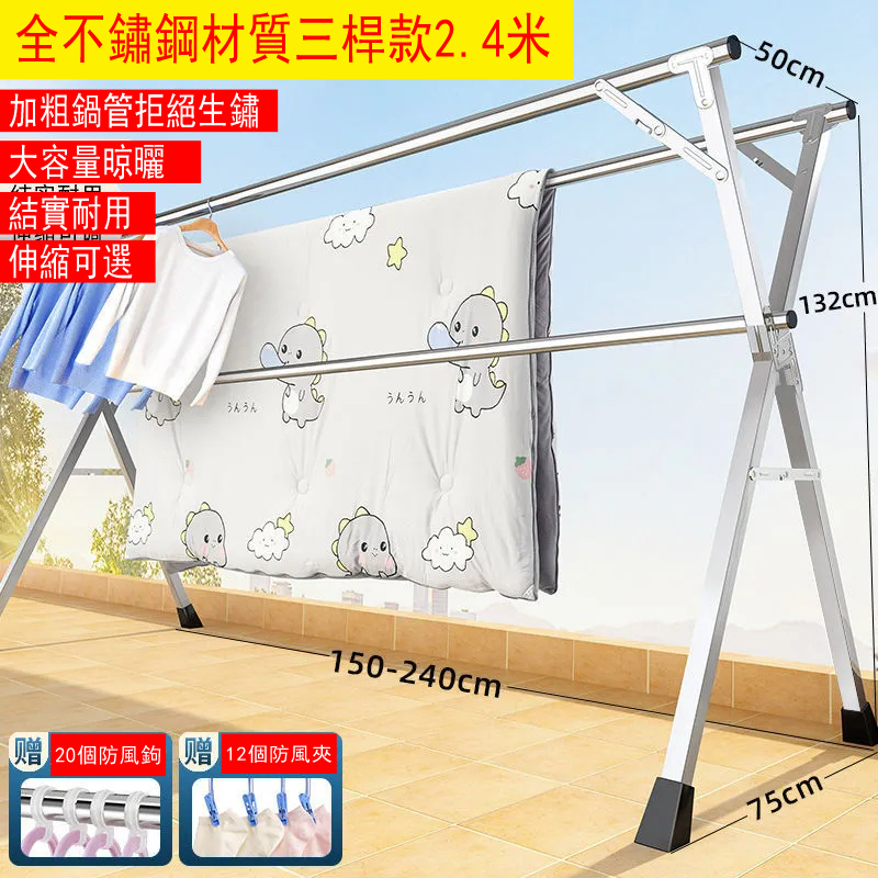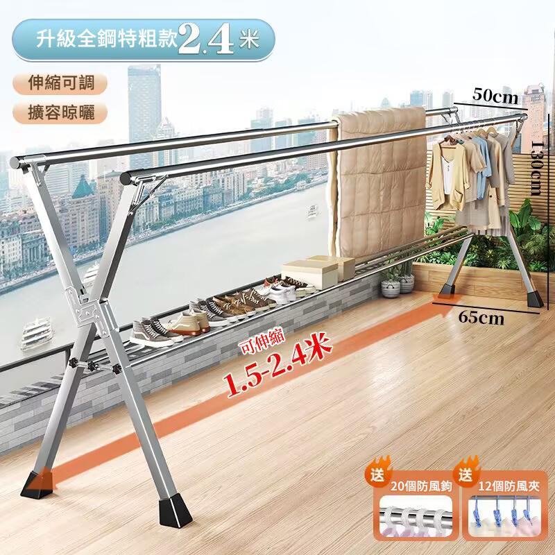 12分鐘前【下單即送20個防風掛鉤】不鏽鋼免安裝折疊家用伸縮式晾衣架 - 2025升級鞋架款2.4米 【可伸縮-送20個防風鉤+12個防風夾】NT$2090