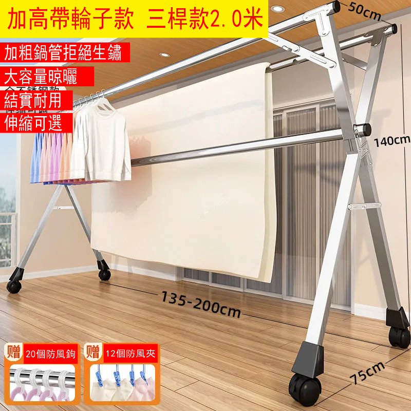 12分鐘前【下單即送20個防風掛鉤】不鏽鋼免安裝折疊家用伸縮式晾衣架 - 2025升級款加萬向輪2.0米【可伸縮-送20個防風鉤+12個防風夾】 NT$1890
