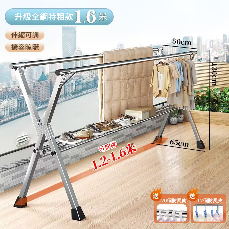 2分鐘前【下單即送20個防風掛鉤】不鏽鋼免安裝折疊家用伸縮式晾衣架 - 2025升級鞋架款1.6米 【可伸縮-送20個防風鉤+12個防風夾】NT$1890