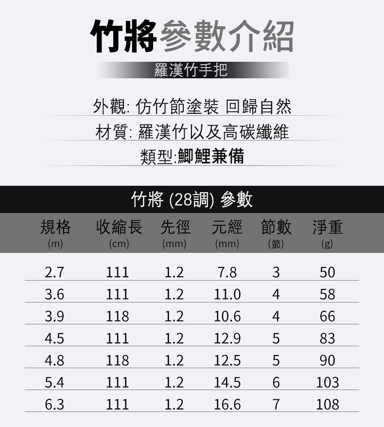 半小時前【傳世大師之作】30年羅漢竹28調鯉魚竿37調鯽魚竿! - 【28調綜合竿】21尺(6.3m)+原裝竿稍+釣魚大禮包NT$ 2380