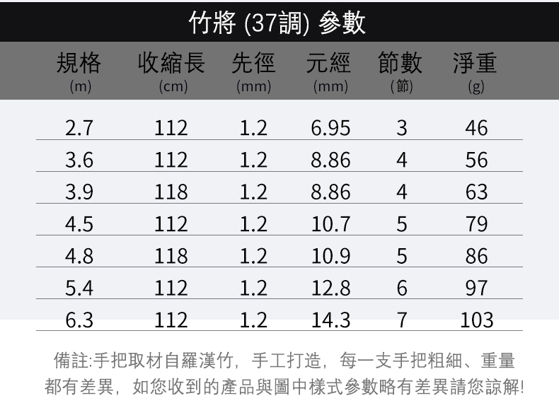 20分鐘前【傳世大師之作】30年羅漢竹28調鯉魚竿37調鯽魚竿! - 【37調鯽魚竿】21尺(6.3m)+原裝竿稍+釣魚大禮包NT$ 2180