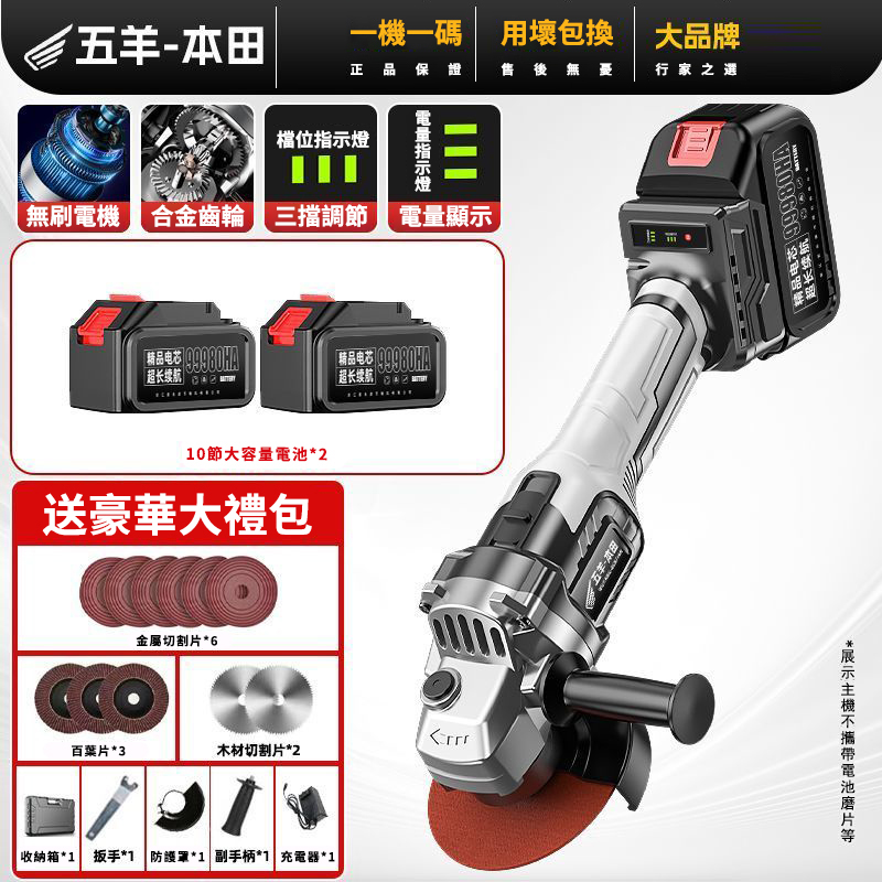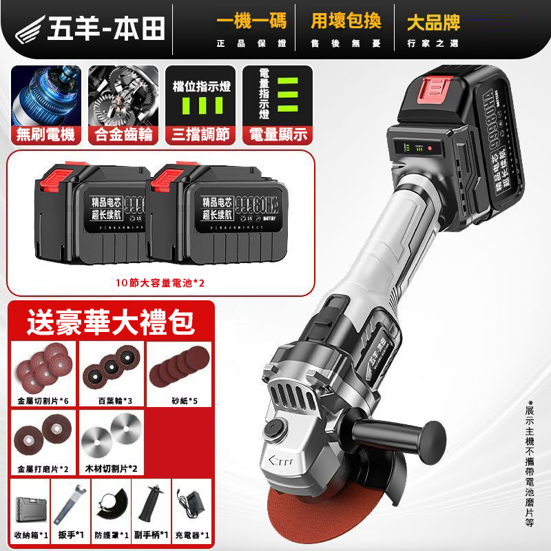 20分鐘前【日本-HONDA】升級帶電顯进口無刷鋰電角磨機 打磨 拋光 切割 一機多用 純銅電機 高效散熱 配置防護護罩 保護你的安全作業 保固三年 損壞包退換 限量出清 - 69800豪華電顯款【1電池】+紙盒款